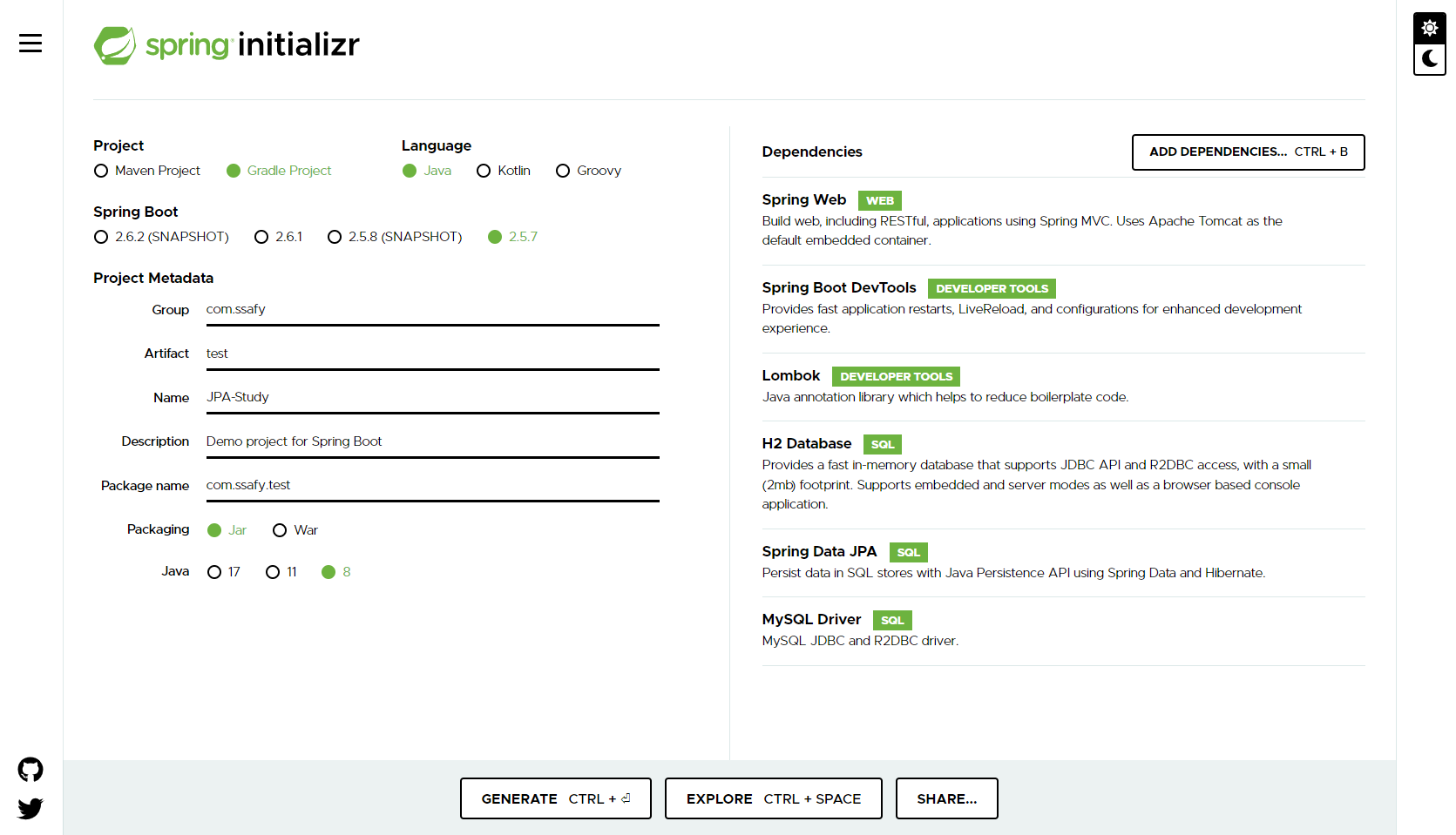 IntelliJ로 프로젝트를 만들어도 좋지만 전 여기서 만드는 게 더 편해서 start.sping.io 사이트에서 진행하겠습니다.