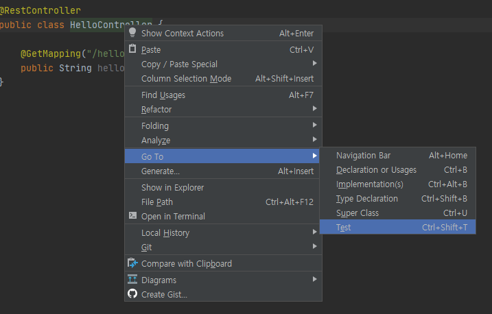 Test class 생성 방법 : 내가 만든 클래스에서 우클릭 → Go To → Test → Create Test → Ok → Test폴더에 생성됨