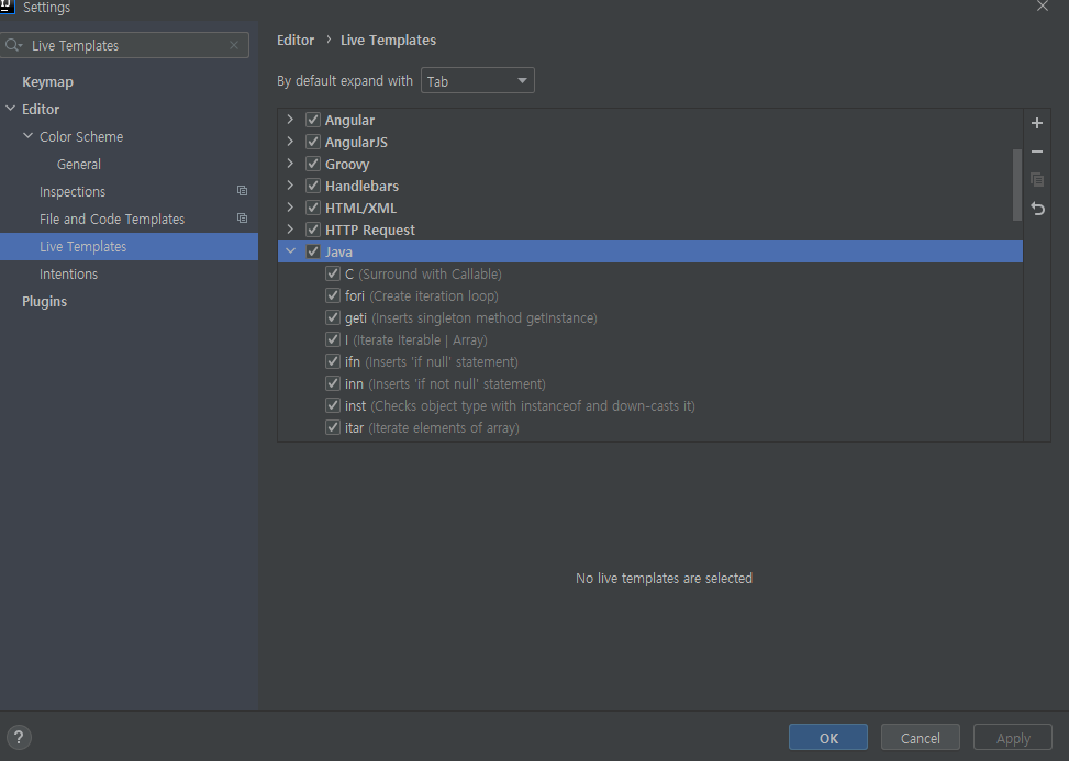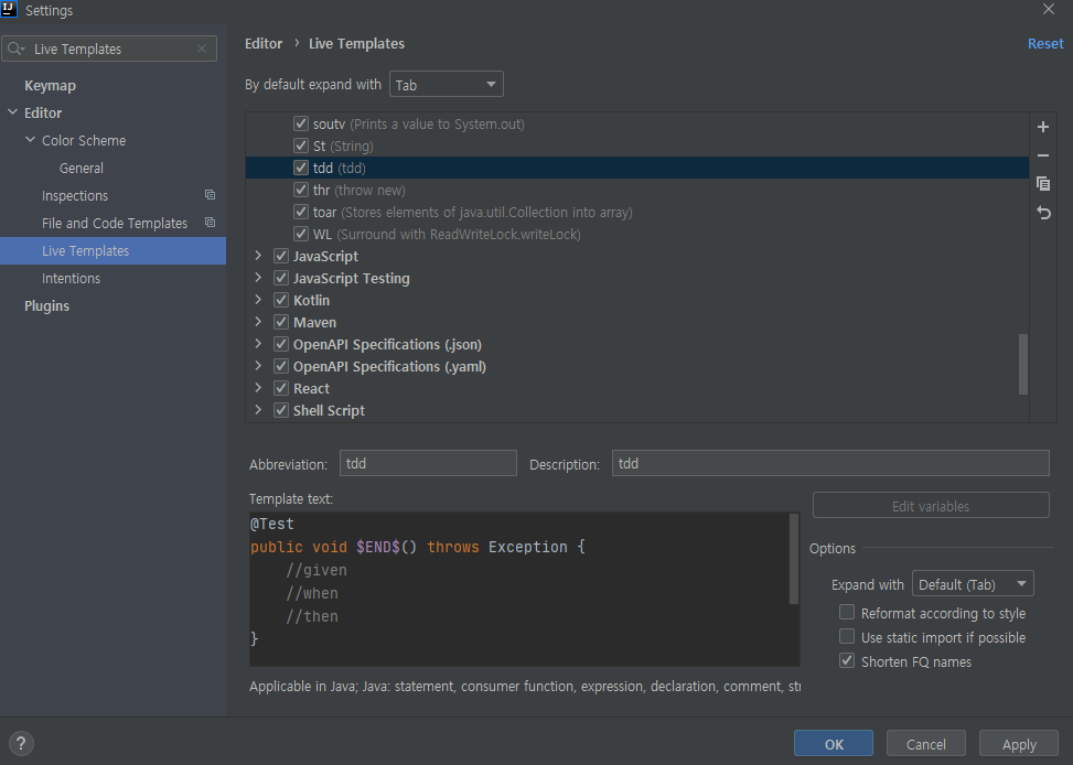 Intellij 좌측상단 File → Live Templates 입력 → Java 에서 + 버튼 클릭